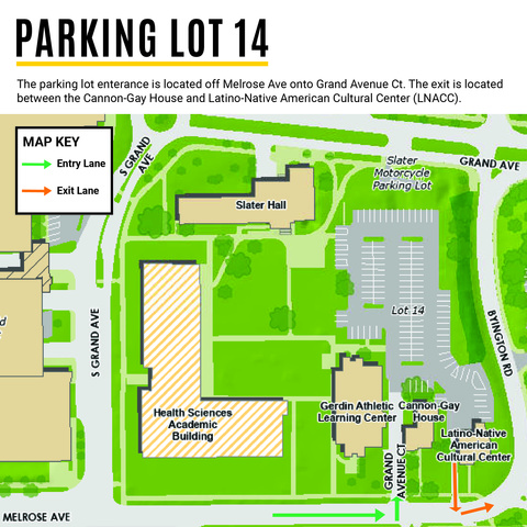 The new Parking Lot 14 has reopened and is located north of Melrose Avenue just east of the previous lot. The new parking lot will help provide additional parking on the West Campus throughout the 10-year facilities master plan.