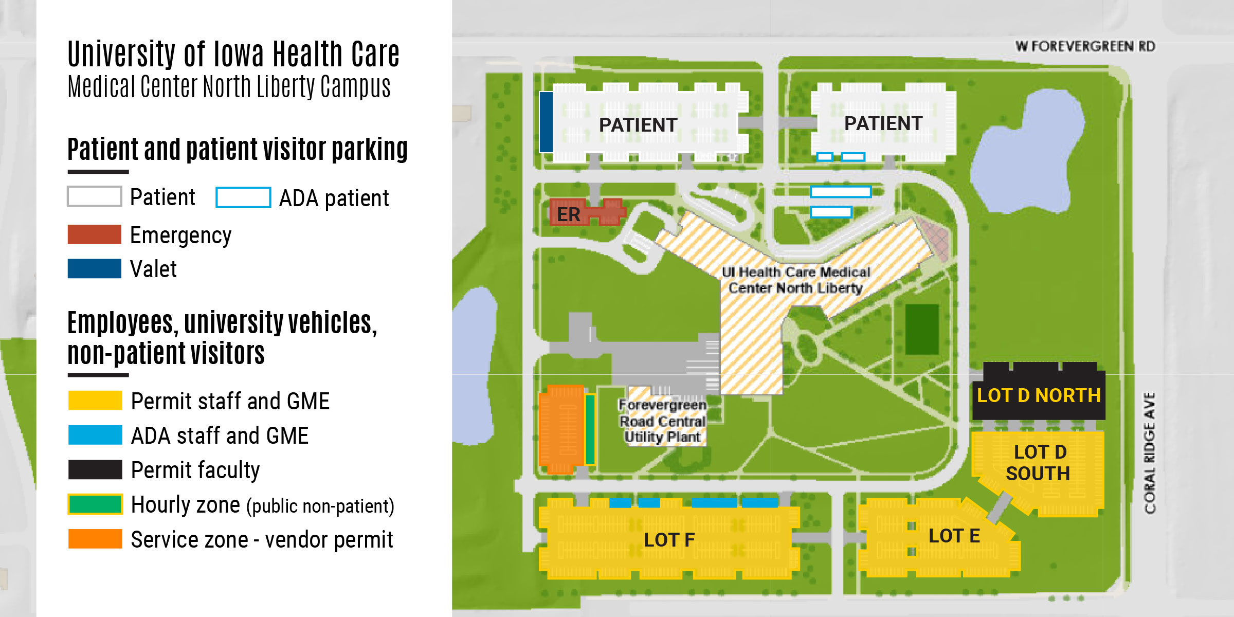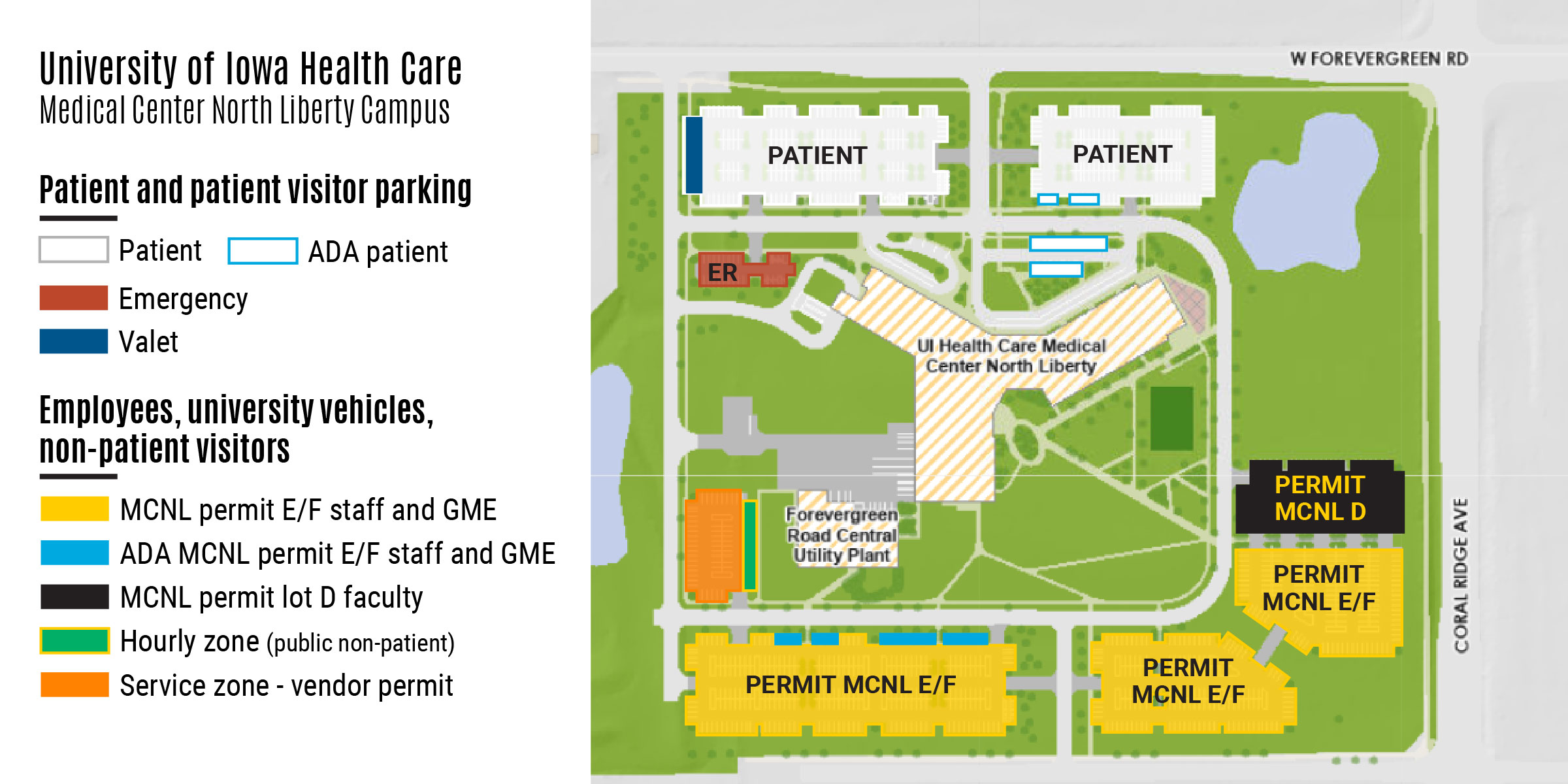 The City of Coralville also honors most university main campus employee and student parking permits, except for NW permits, in the IRL West Ramp. Employees are assigned to park in the upper levels of the IRL West Ramp, leaving the lower floors for patient and public parking.